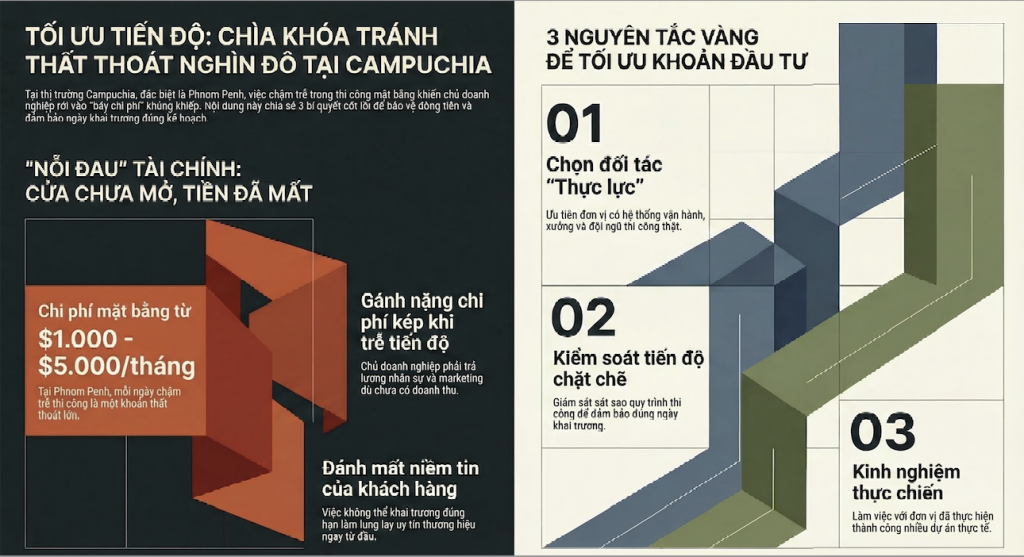 Trong giới kinh doanh tại Campuchia, có một thực tế khốc liệt mà không phải chủ doanh nghiệp nào cũng lường trước: Cửa hàng chưa mở, doanh thu chưa có, nhưng “máu” tài chính vẫn chảy đều đặn mỗi ngày. Sự chậm trễ trong thi công không đơn thuần là một vài ngày trễ hẹn; đó là “kẻ sát nhân thầm lặng” bóp nghẹt uy tín thương hiệu và bào mòn dòng vốn ngay từ vạch xuất phát.