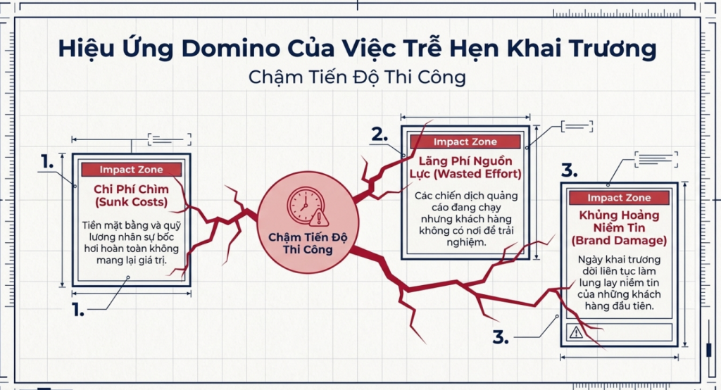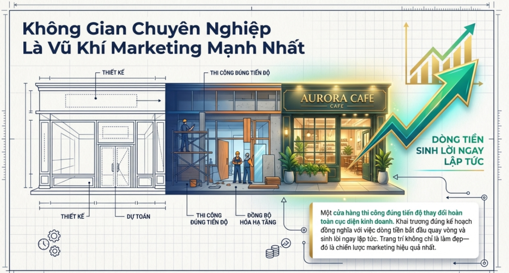 Trong tư duy của một chuyên gia vận hành, thi công đúng tiến độ là chiến lược marketing hiệu quả nhất. Mỗi ngày cửa hàng còn ngổn ngang gạch đá, thương hiệu của bạn đang mất đi “social proof” (bằng chứng xã hội) và niềm tin từ khách hàng tiềm năng.